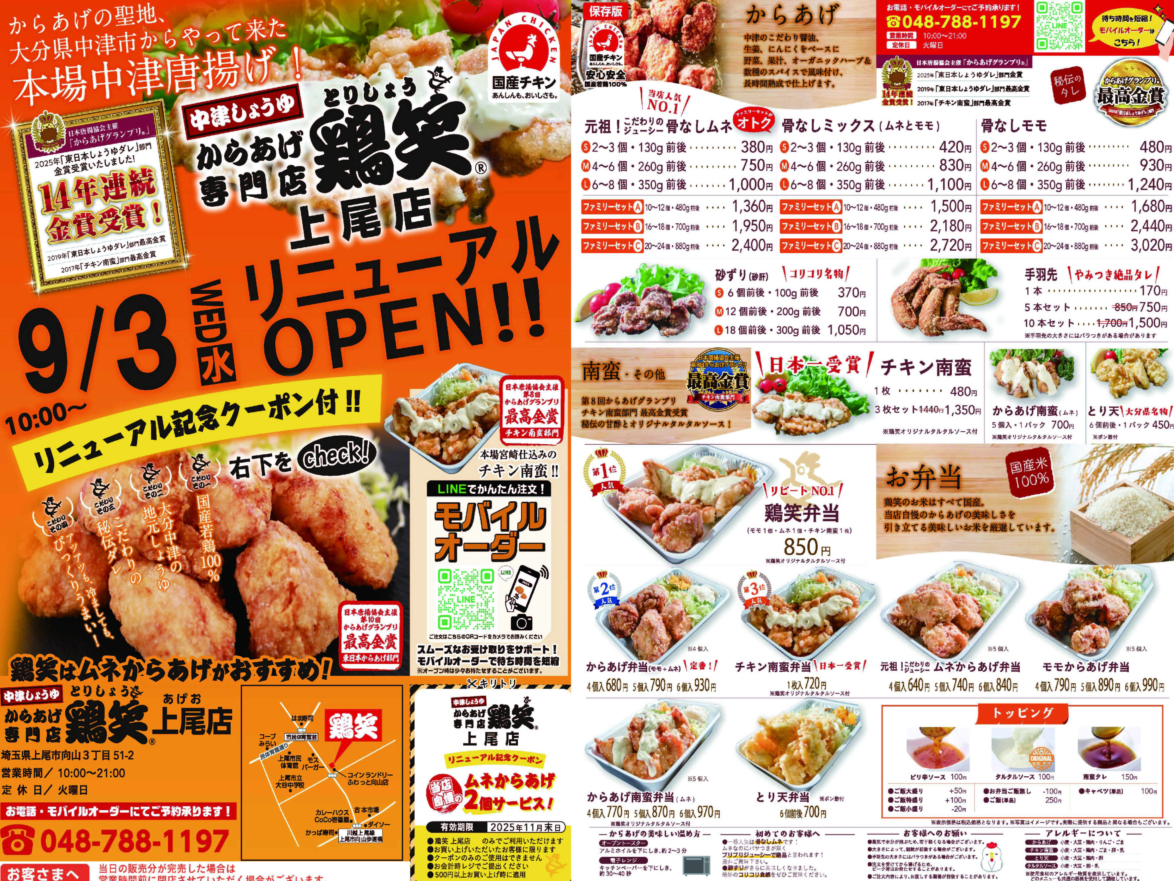 からあげ専門店 鶏笑 上尾店の最新情報一覧